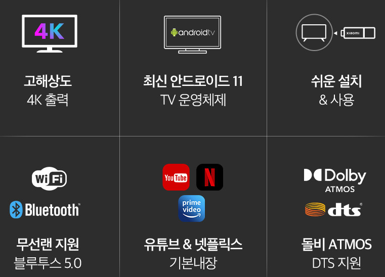 샤오미 TV 스틱은 고해상도 출력과 최신 안드로이드11 TV 운영체제가 탑재되어 있다. 그리고 쉬운 설치와 사용이 가능하여, 설치시 와이파이와 모니터만 있다면 어디서든 시청 가능하다.