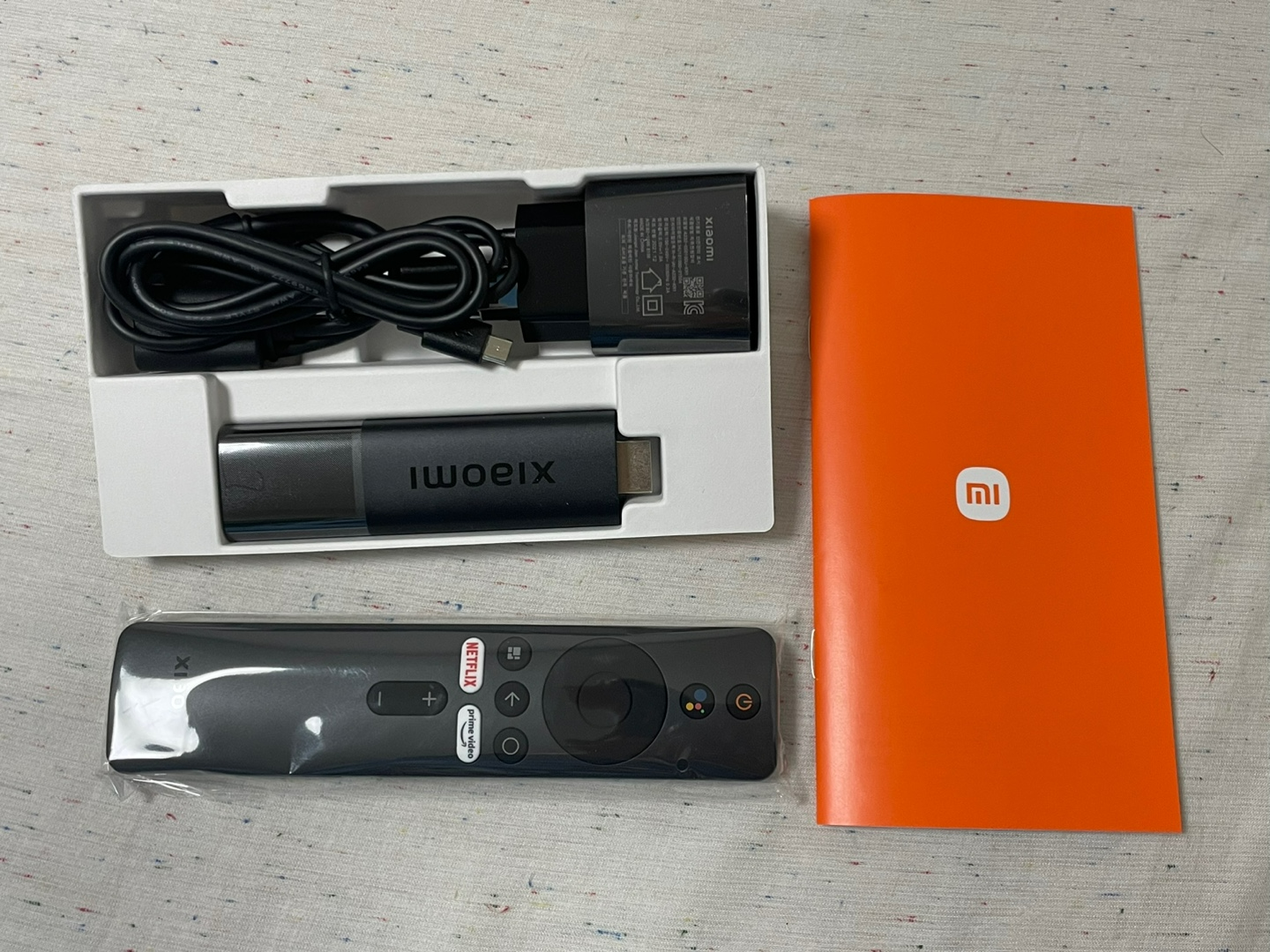 샤오미 TV스틱 구성품으로는 샤오미 TV 스틱4K, 리모컨, 전원 어댑터, 사용자 매뉴얼, HDMI 확장 케이블로 구성되어있다.