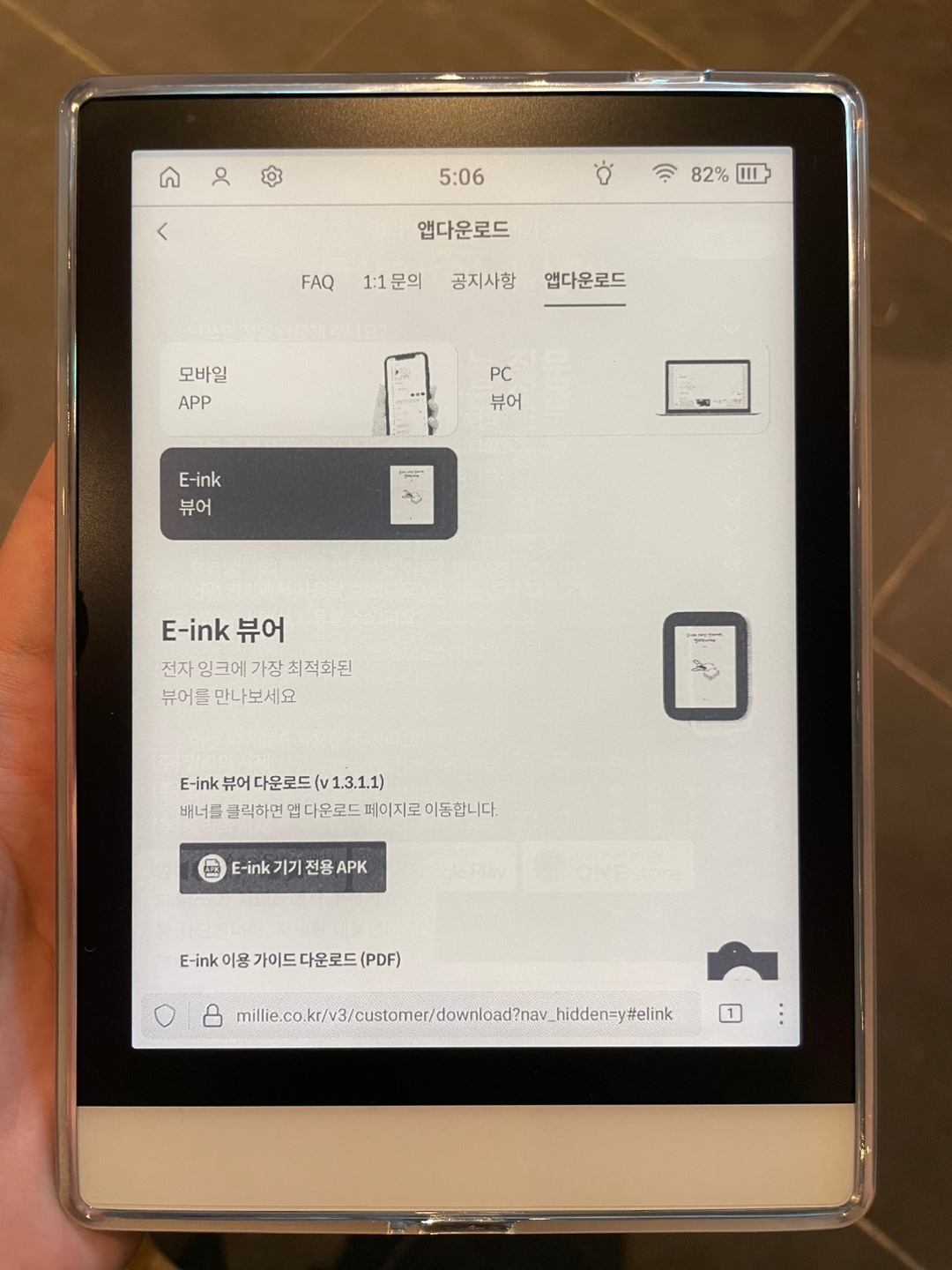 이북리더기에서 인터넷 접속 후 밀리의 서재 사이트에 들어가서 맨아래로 내리면 앱다운로드 항목이 보인다. 그곳에서 "E-ink 뷰어"를 다운받아준다. 그리고 Firefox도 다운받아준다.