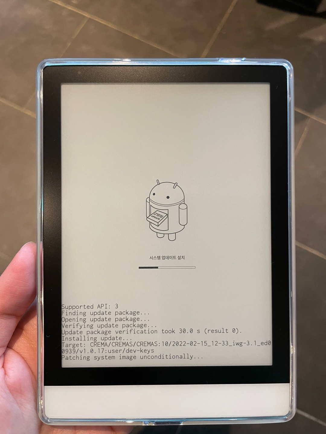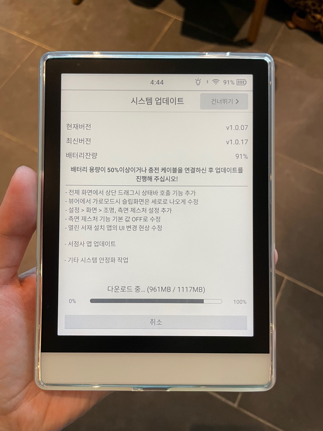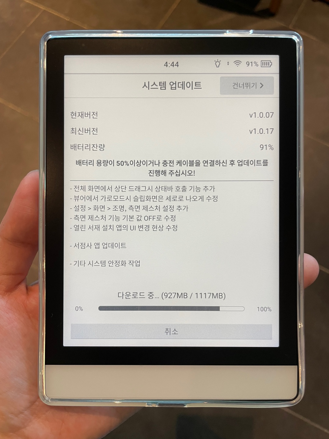 크레마S 이북리더기에 투명젤리케이스를 씌운 모습이다. 그리고 아직 업데이트 진행중인 모습.