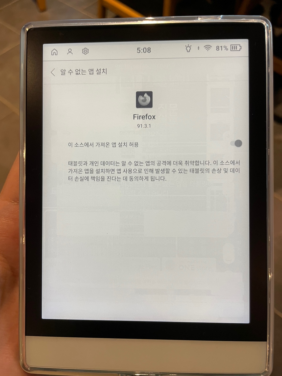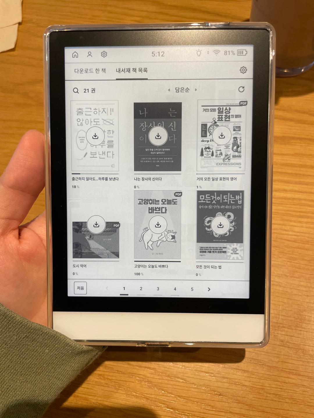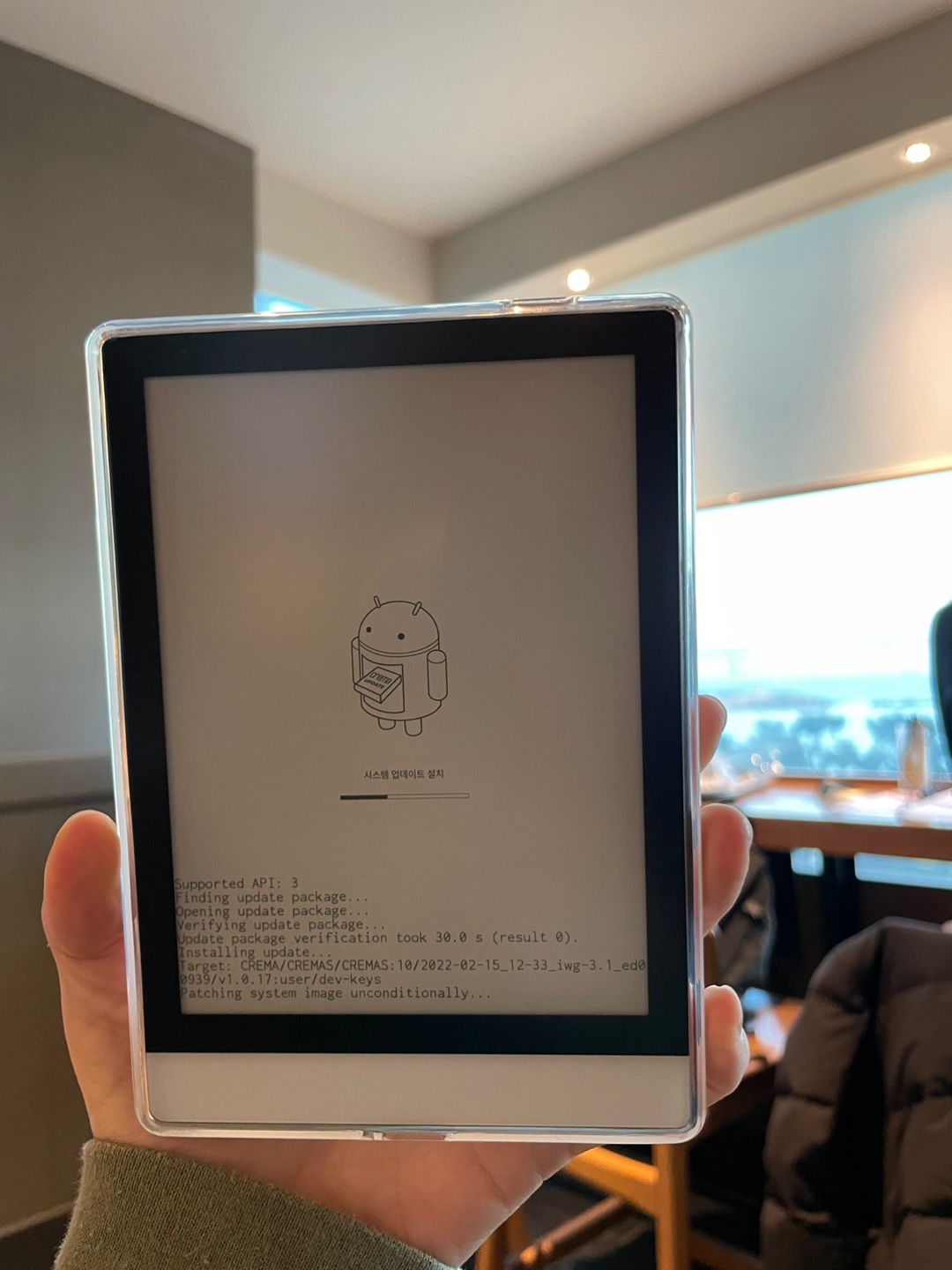 크레마S 이북리더기에 투명젤리케이스를 씌운 모습이다. 그리고 아직 업데이트 진행중인 모습.