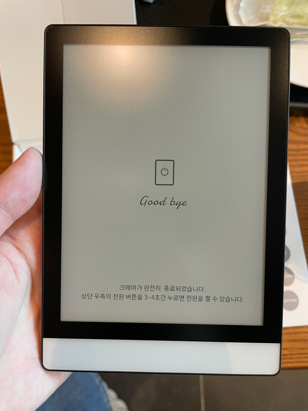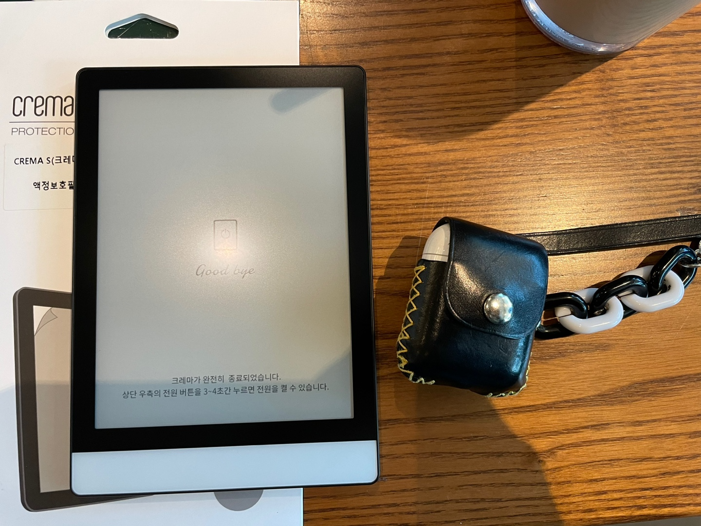 에어팟과 비교해도 기여운 사이즈의 크레마S(CremaS) 이북리더기이다. 개봉하면 위 사진처럼 "크레마가 완전히 종료되었습니다. 상단 우측의 전원 버튼을 3~4초간 누르면 전원을 켤 수 있습니다."라고 나온다. 설명대로 전원버튼을 3~4초간 누르고 전원을 켜주었다.