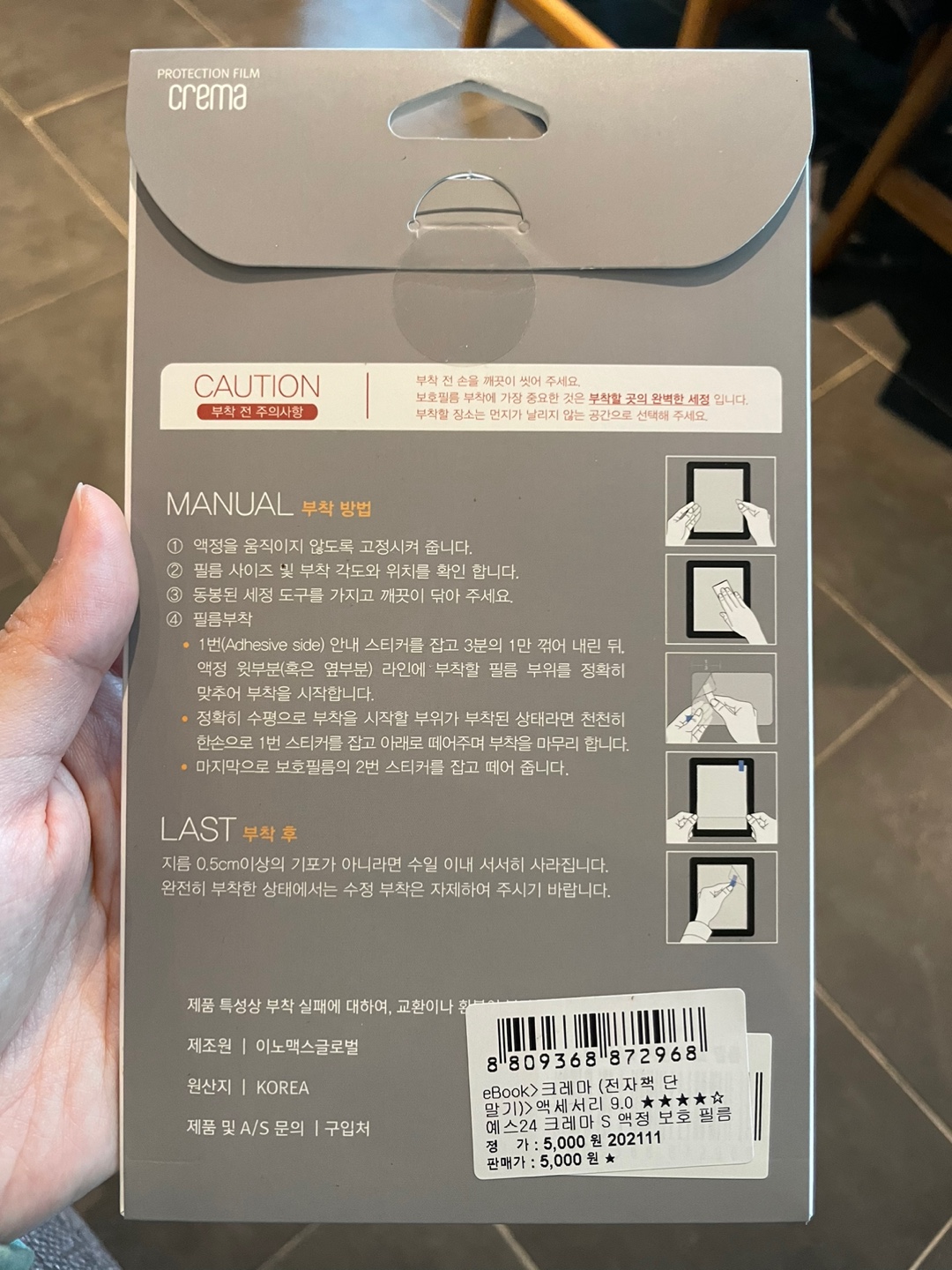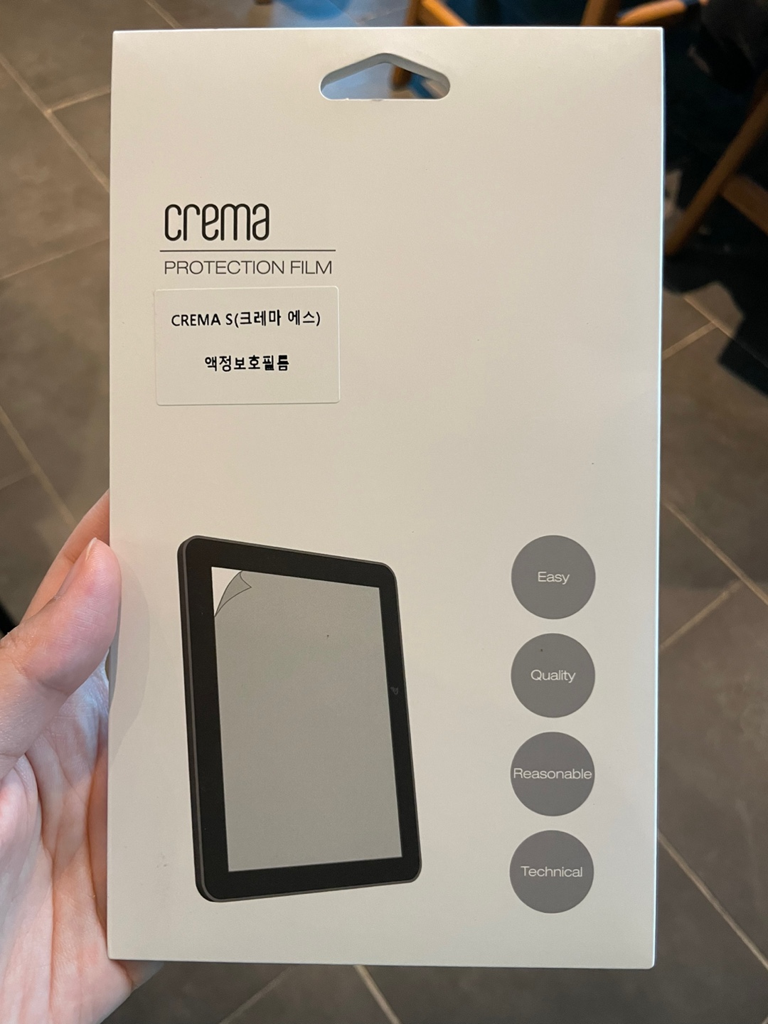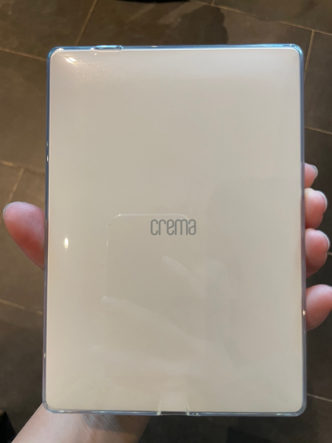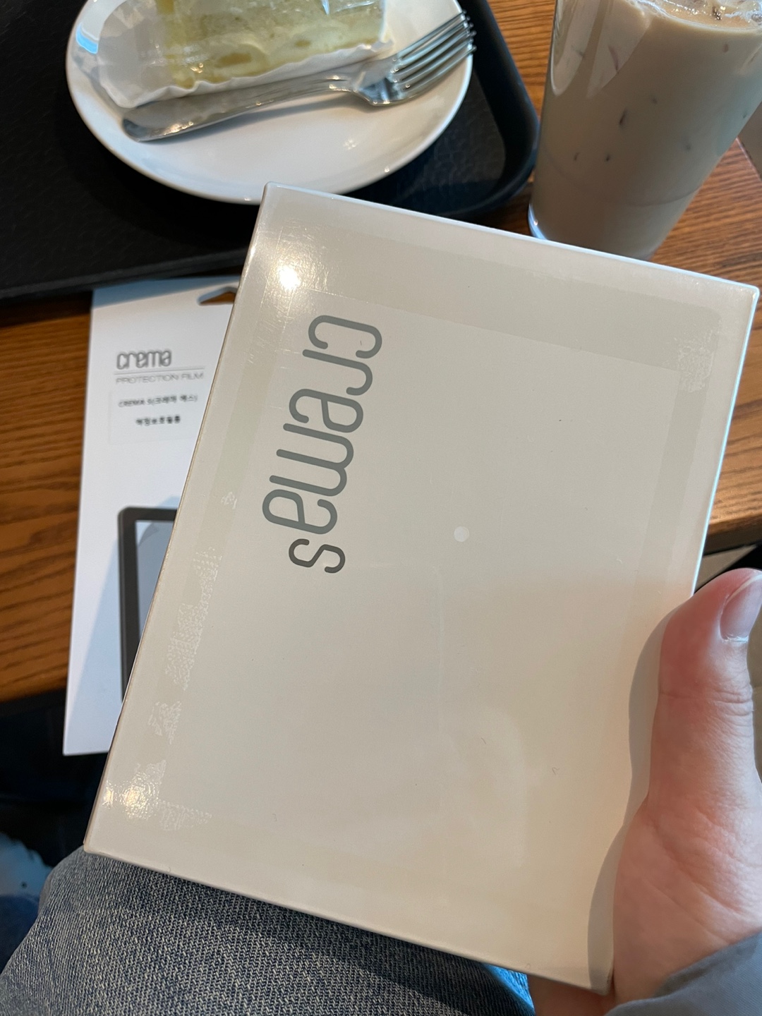 여기서부턴 선물 받은 후 이북리더기 크레마S 개봉하는 사진들이다. yes24 서점에서 오프라인으로 구매를 하였다고 한다. 구매시 보호필름과 젤리 케이스도 함께 구매하여 선물 받았다. 패키지 케이스도 한손에 잡힌다. 열기전부터 큰 기대감을 가지고 개봉하였다.