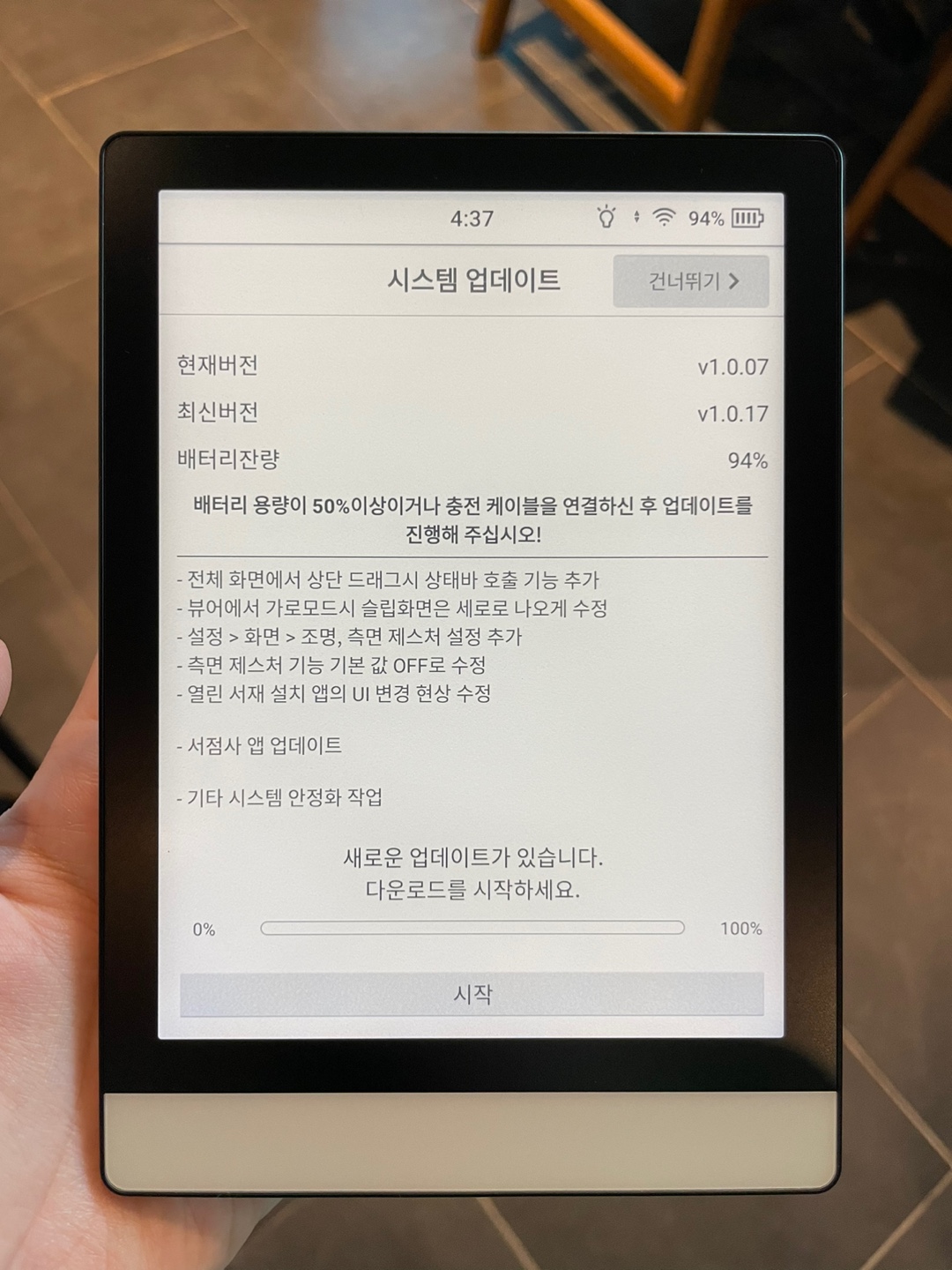 기본 기기의 버전보다 업데이트 항목이 더 있기 때문에 업데이트를 먼저 시켜준다. 이북리더기 크레마S 만약 배터리가 50%미만일 경우 크레마S 이북리더기는 업데이트가 되지 않으므로, 같이 동봉되어있던 잭을 이용하여 충전시킨 후 업데이트 진행한다.