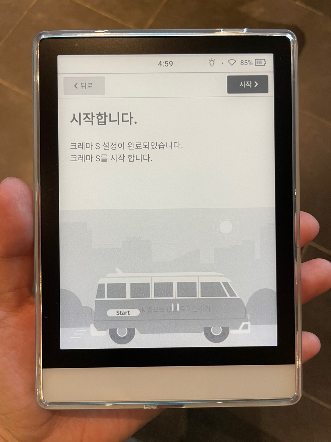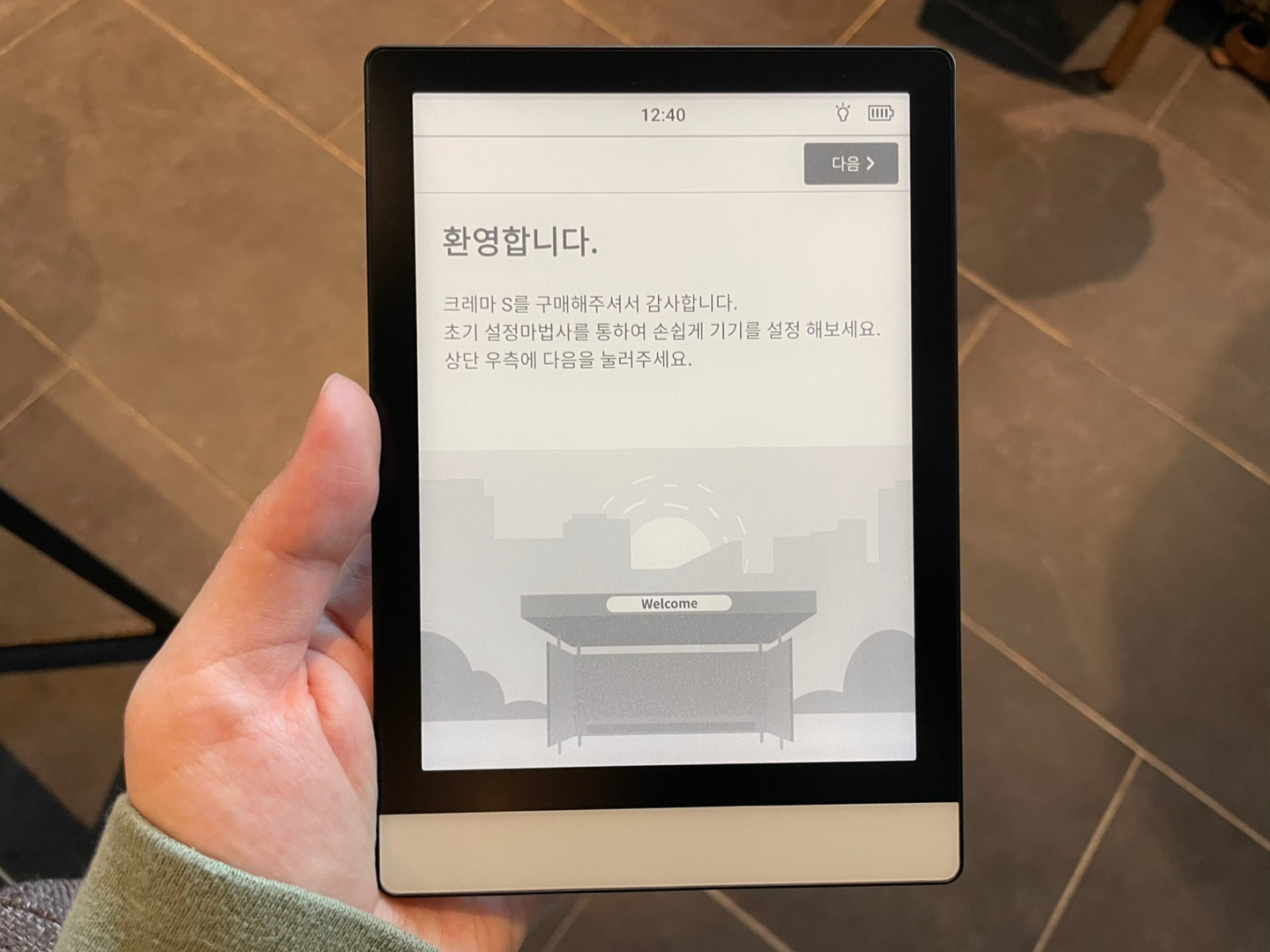이북리더기 크레마S 화면을 켜면 진짜 종이같은 느낌의 전자잉크의 화면이 보인다. 설명대로 '다음'버튼을 눌러주었다.