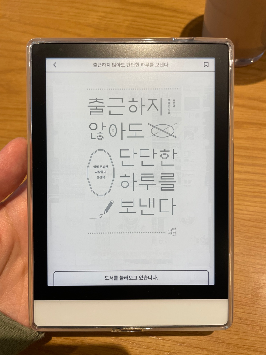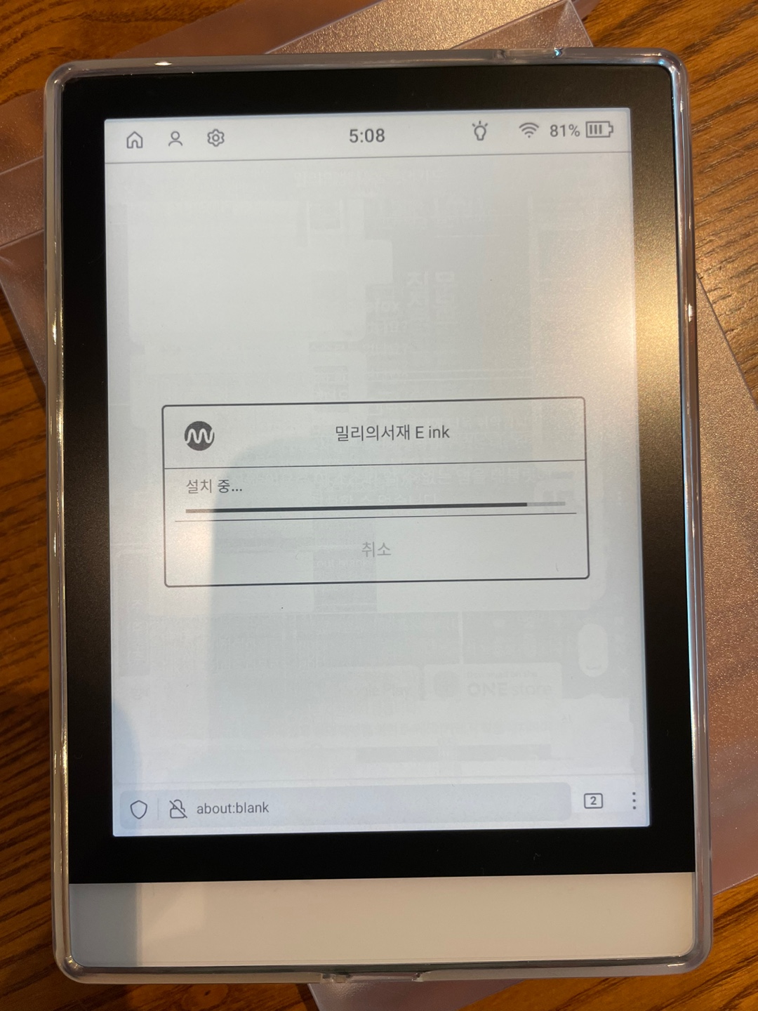 크레마S 이북리더기에 투명젤리케이스를 씌운 모습이다. 그리고 아직 업데이트 진행중인 모습.